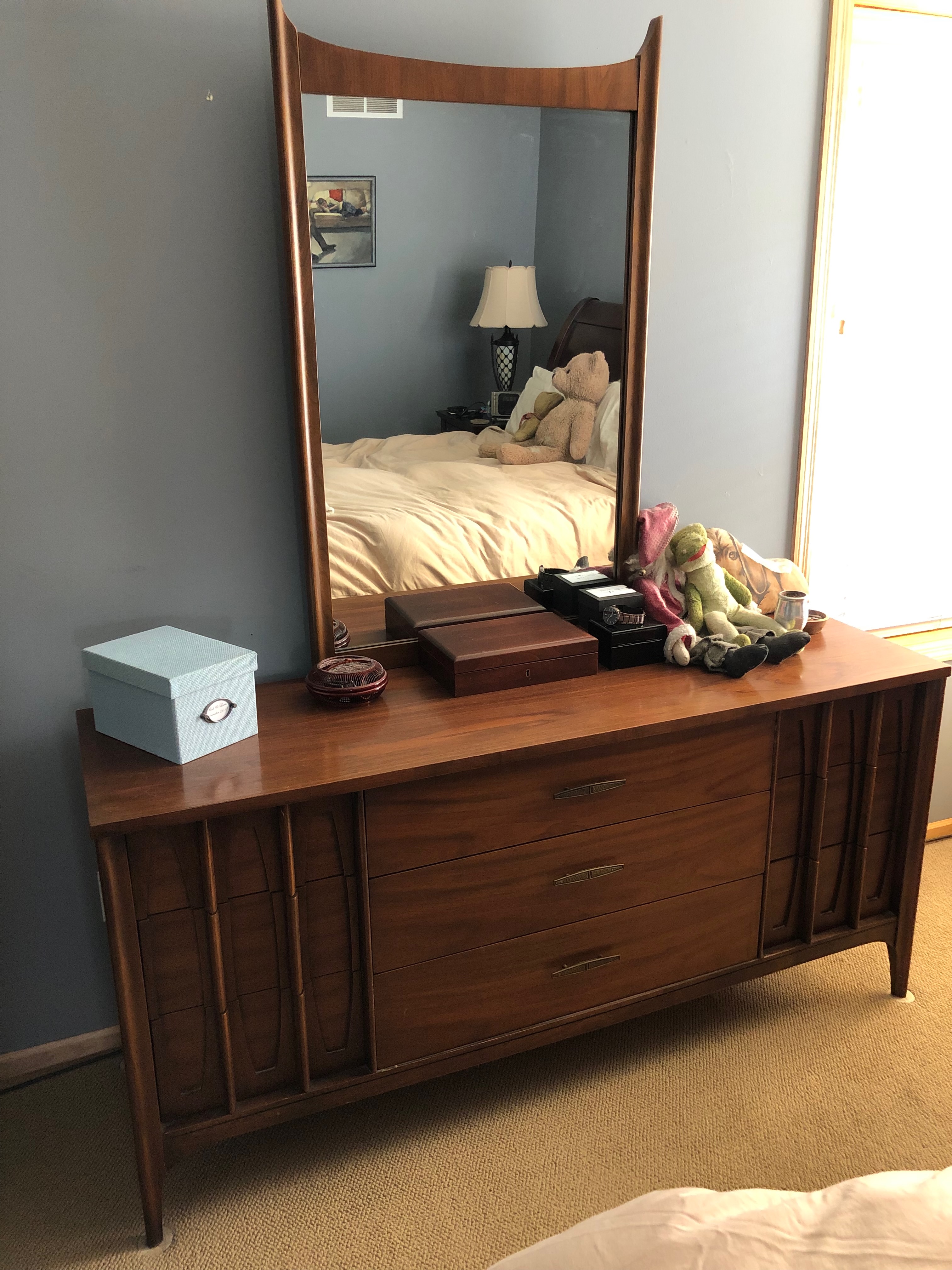 I didn’t even think about the furniture, assuming the expense of shipping it 1,000 miles wouldn’t be worth it. And then my husband took one look at the mid-century modern bedroom set and insisted we take it. I’m so glad he did. That stuff is sturdy, still beautiful after 60 years and ready for more.