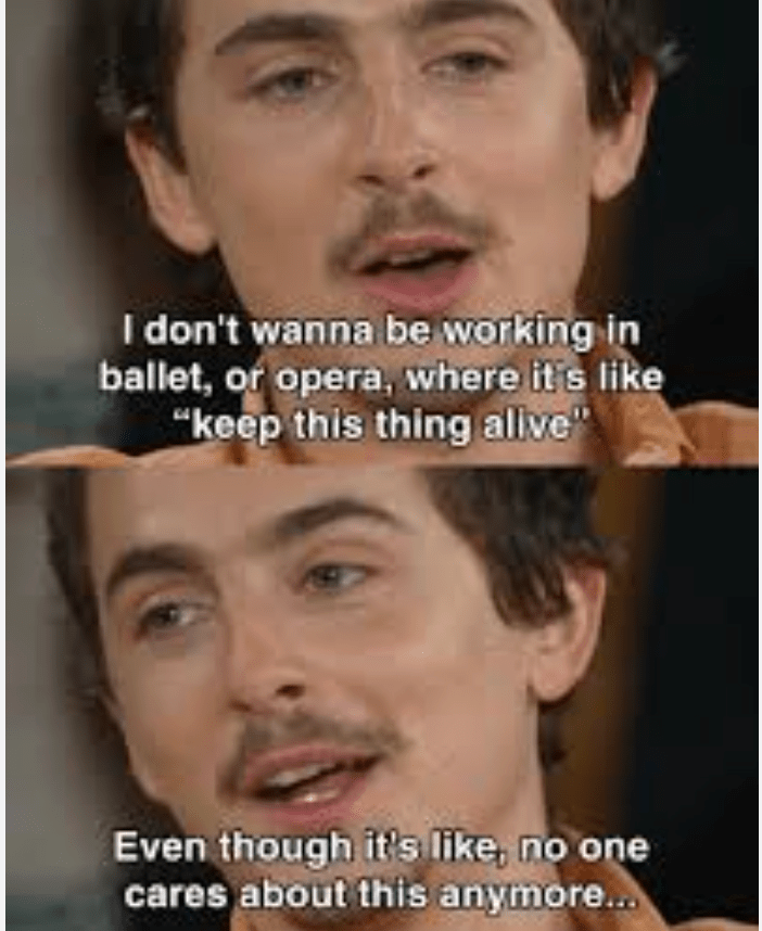 Let’s take his own career as evidence. The films for which he’s received Oscar nominations (Call Me by Your Name, A Complete Unknown, and Marty Supreme) took in a combined total of about $350 million in box office worldwide. By comparison, Dune 2 topped out at almost twice that amount. In other words, crap sells and art doesn’t. Welcome to the world of opera and ballet, Timmy.